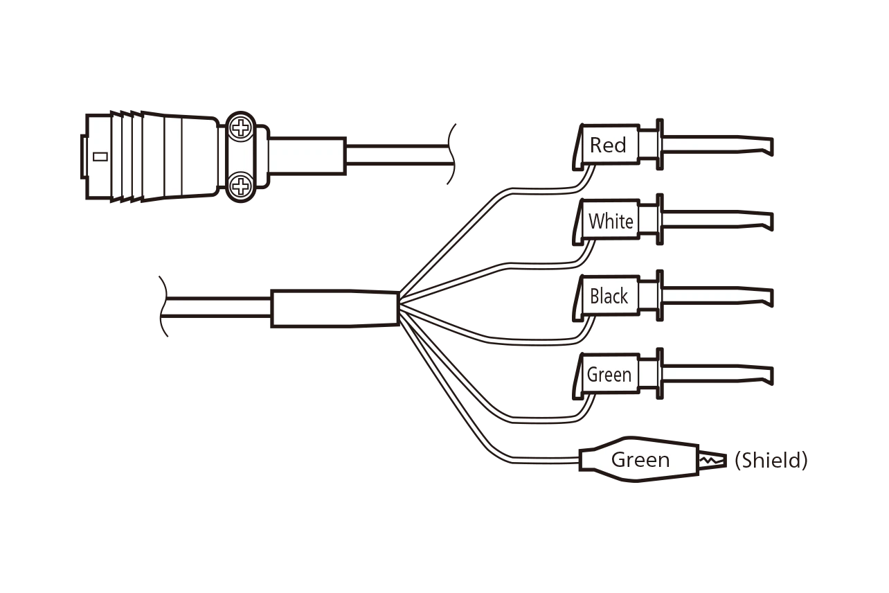 The 4 core cable has a test clip at the end and the shield cable is an input cable with an alligator clip at the end.