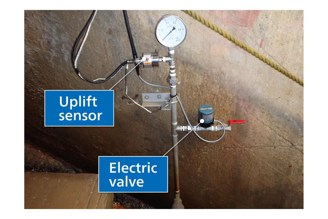 - Automatic Uplift Pressure Monitoring SystemIn this system, an electric uplift gauge and electric valve are assembled to the uplift monitoring hole pipework.