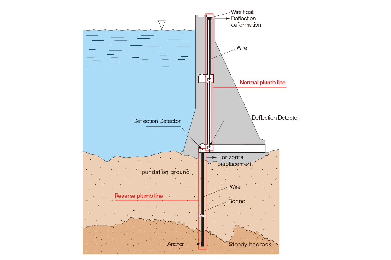 - Dam Measuring SystemPlumb Line SystemsThis system monitors horizontal displacement and deformation by measuring a plumb line (perpendicular line used as a reference) installed inside the dam body, and is crucial for managing safety.