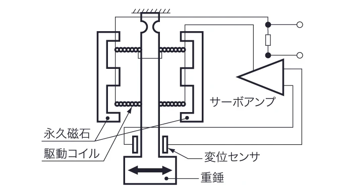 図の基本構造で、加速度が加わると重錘は中立位置から変位します。この量は変位センサで検知され、サーボ増幅器を経て重錘支持部に固定された駆動コイルに与えられます。永久磁石による磁場中に置かれた駆動コイルに電流が流れると、電磁力が作用し、重錘は元の位置に戻されます。この電流は加わった加速度に比例しているので、電流ループ内に挿入された抵抗両端からは加速度に比例した電圧が取り出されます。