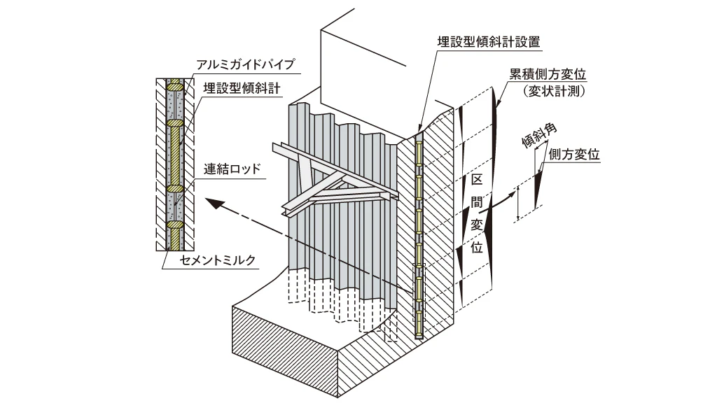 BKJ-A埋設型傾斜計ボーリング孔または山留壁に多段に埋設し、深度別の傾斜角を測定して、地盤または山留壁の側方変位を計測できるセンサです。挿入型傾斜計による計測方法に比べて迅速にデータが得られますので、都市土木現場の情報化施工に伴う計測管理等に適しています。本傾斜計は、ボーリング孔内、または山留壁内にアルミガイドパイプをあらかじめ埋設し、グラウトを行います。 定格容量:±5°,10° 設置段数:最大20段 非直線性:±0.5%RO以内購入のお問い合せ カタログで見る使用例土留計測BKJ-A-10 1方向,±10°用BKJ-A-10-D 2方向,±10°用BKJ-A-5 1方向,±5°用BKJ-A-5-D 2方向,±5°用BKJ-ABKJ-A-10 1方向,±10°用BKJ-ABKJ-A-10-D 2方向,±10°用BKJ-ABKJ-A-5 1方向,±5°用BKJ-ABKJ-A-5-D 2方向,±5°用取扱説明書BKJ-A 取扱説明書(483.7 KB)CADデータBKJ-A(376KB)BKJ-A-D(378KB)共和技報埋設型傾斜計BKJ-A型、BKJ-A-D型について主な適合アクセサリアルミガイド
