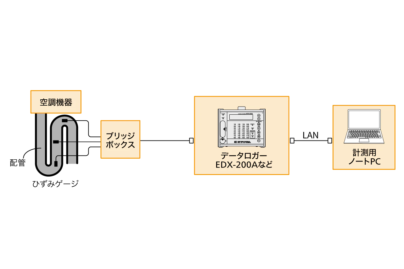 エアコン等のコンプレッサから発生する振動により、配管にかかる応力を測定するシステムです。